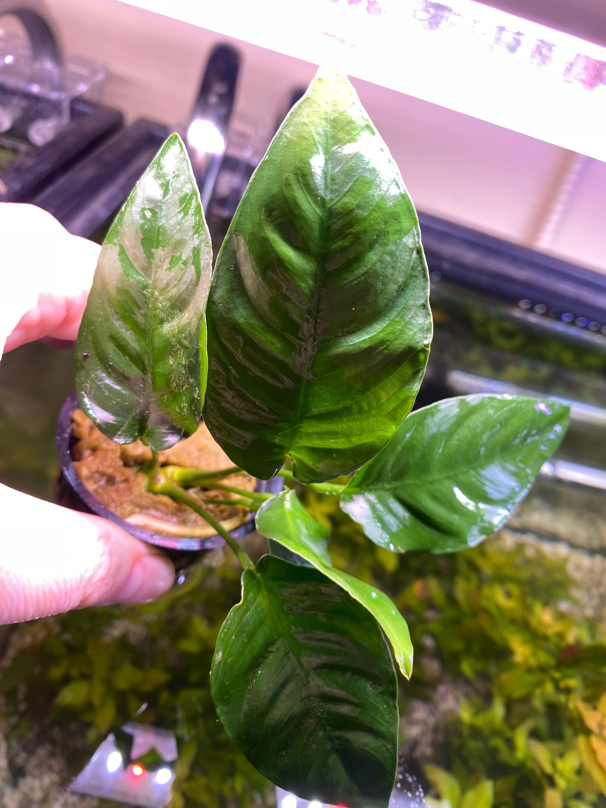 The Anubias Barteri "Striped" is the cousin of the Anubias Barteri, except this plant exhibits ruffles or stripes in the leaves giving it a very unique look.