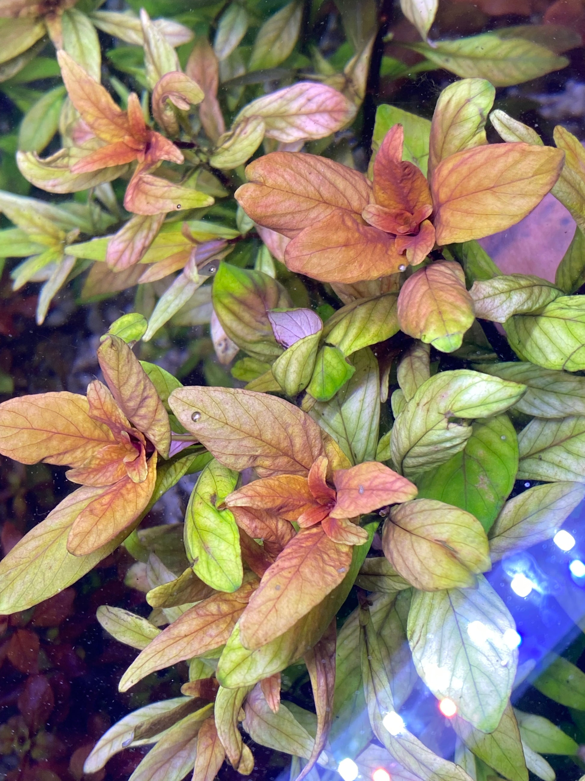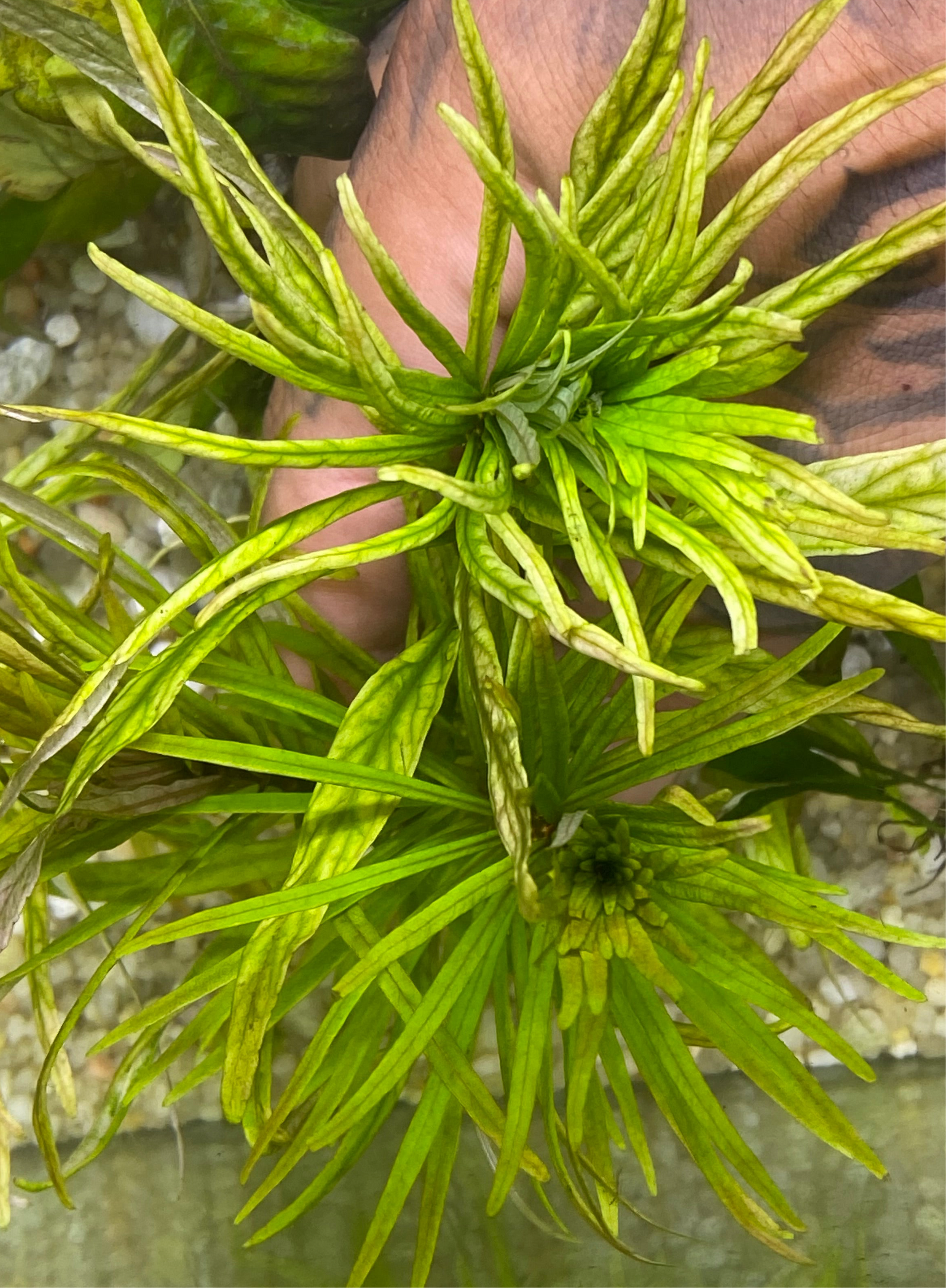Ludwigia Inclinata Cuba is a gorgeous stem plant and a great addition to any tank! Under high lighting this plant exhibits soft orange and red tones with purple veins. A little bit more sensitive to tank conditions we recommend medium to high light as well as a stable tank with good liquid fertilization. CO2 is not required but it does help with plant growth. Once converted to submerged grown the leaves get really long and skinny and grow tight together often resembling the sun!