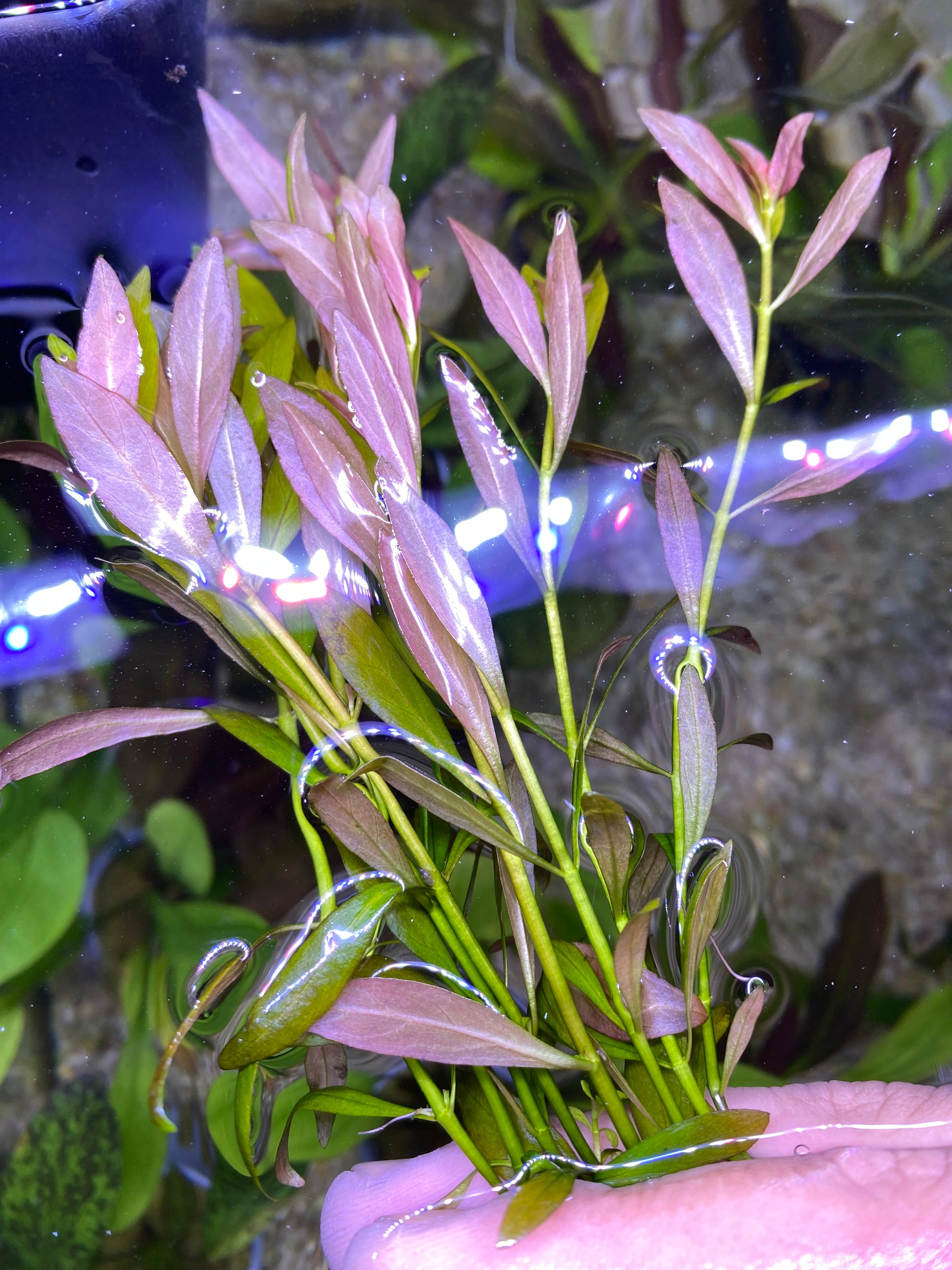 Ludwigia Repens narrow leaf is a very easy to grow beginner-friendly aquatic plant. It can be grow in low to medium light. When grown in medium to high light plants will start to grow a more red/purple color on the leaves. A great addition to a background of an aquarium, Narrow leaf does grow taller. Nitrate deficiency tends to also bring out more red/purple in the leaves. Propagation can be achieved by taking cuttings from the main stem of the plant and replanting into the substrate.