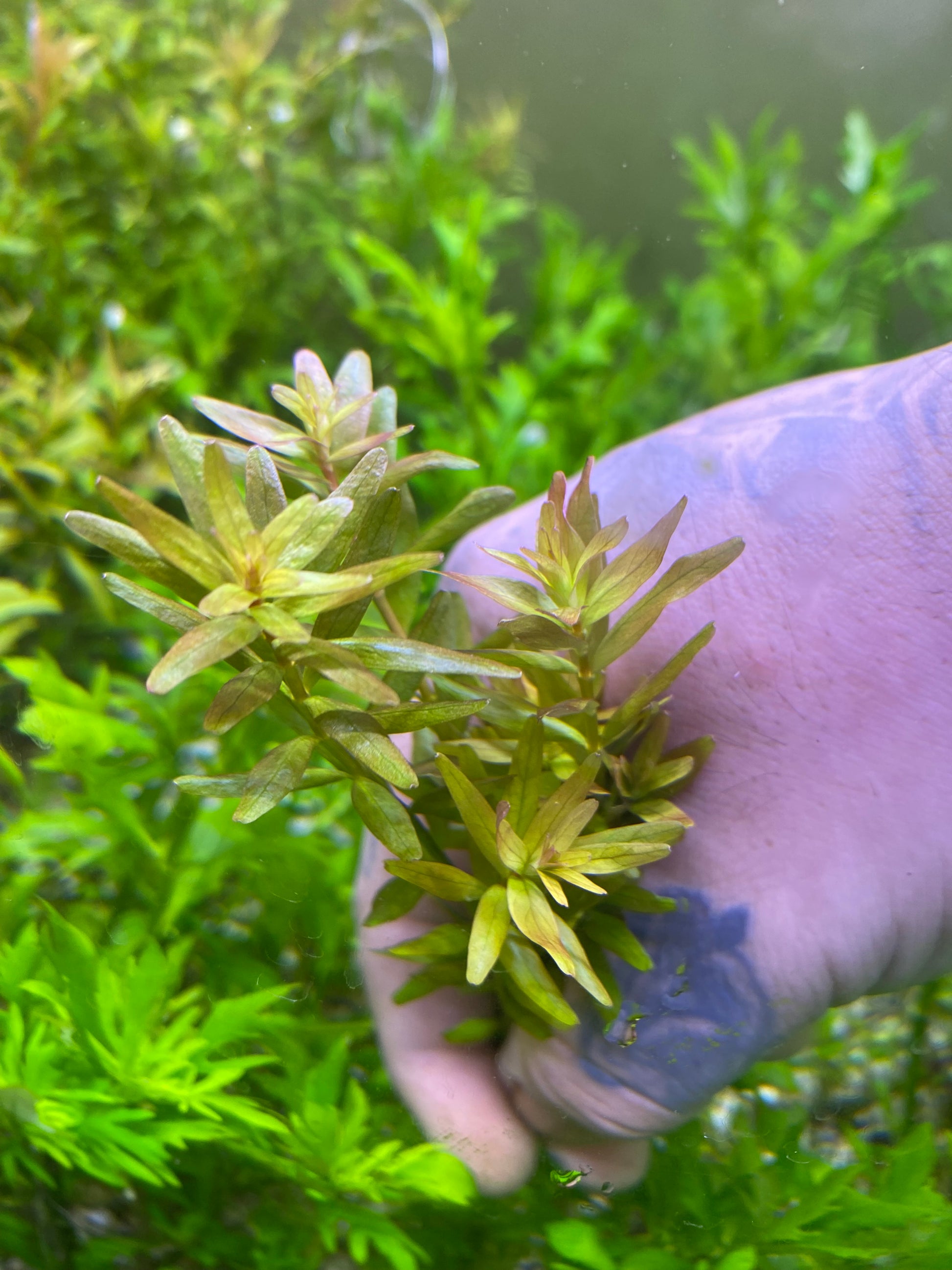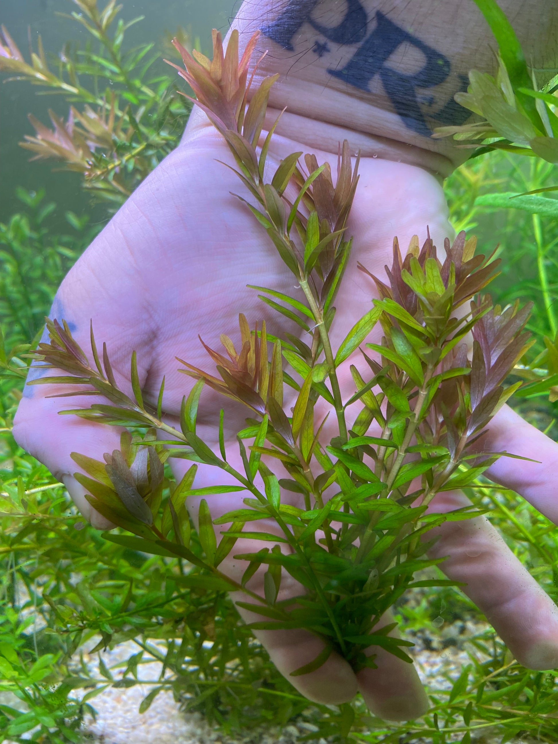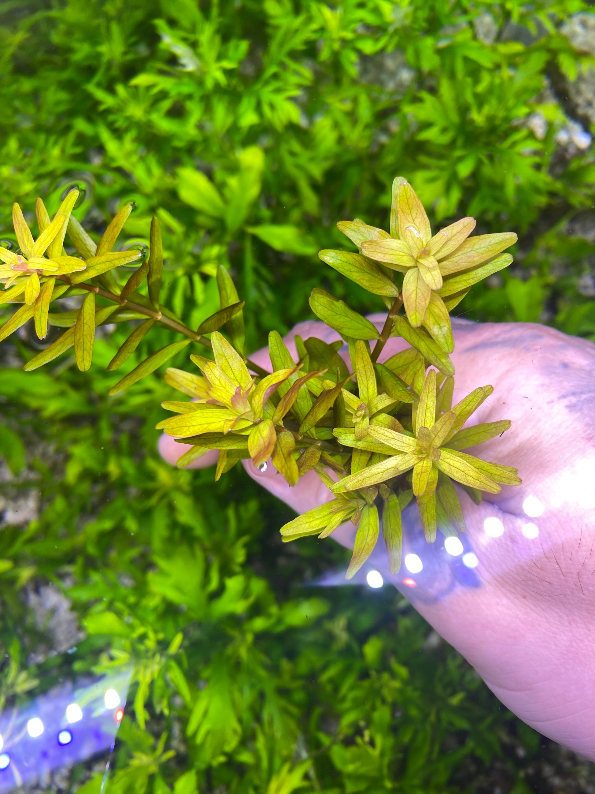 Rotala Rotundifolia is one of the easiest stem plants to care for. It can be in a variety of water parameters and doesn't need fancy lighting. Under low to medium light it yields a more yellow-green color, and high lighting yields a pink color and pink undertones on the leaves. It can be easily propagated by snipping the top and replanting. A great addition to a midground or background.