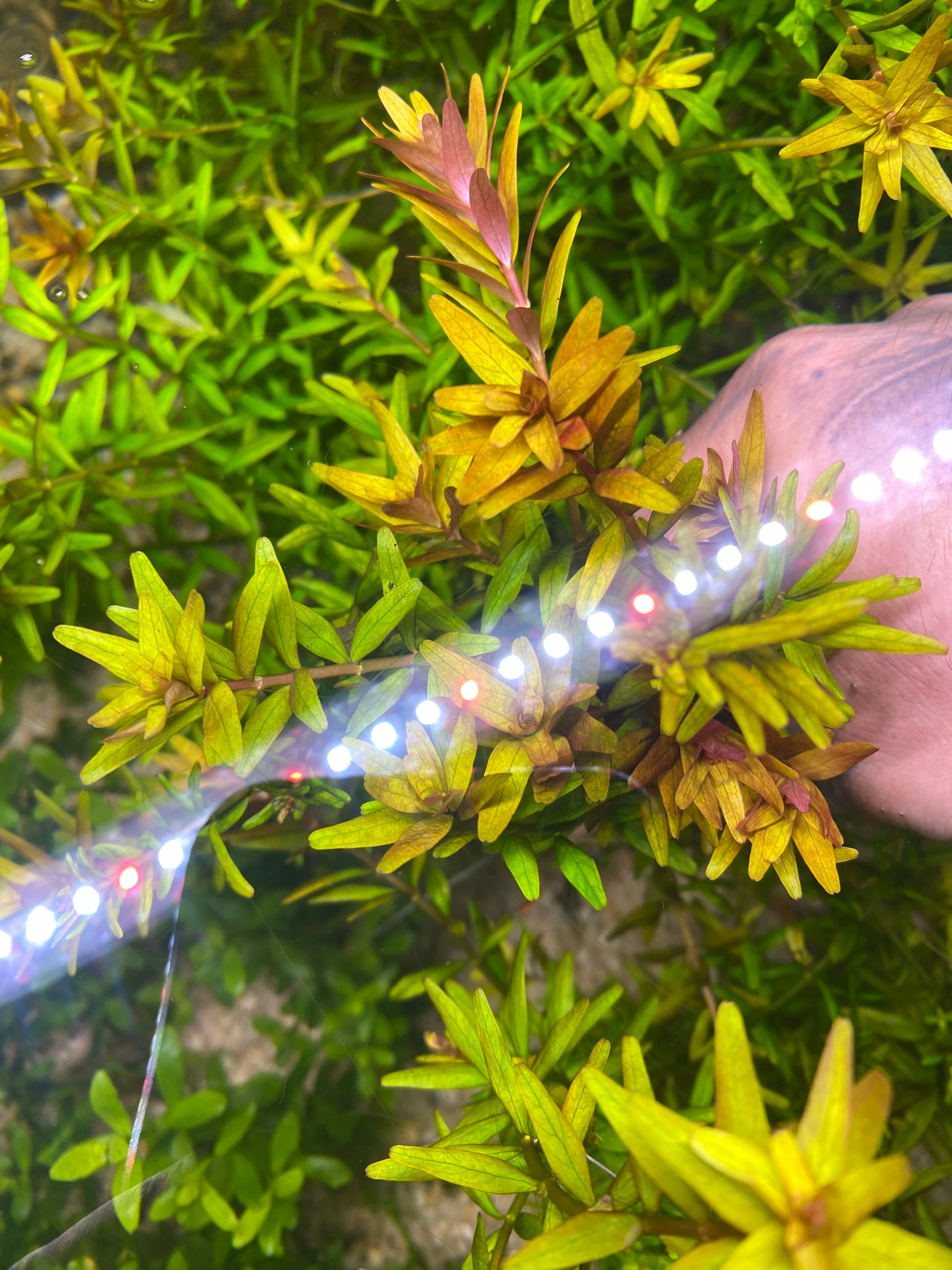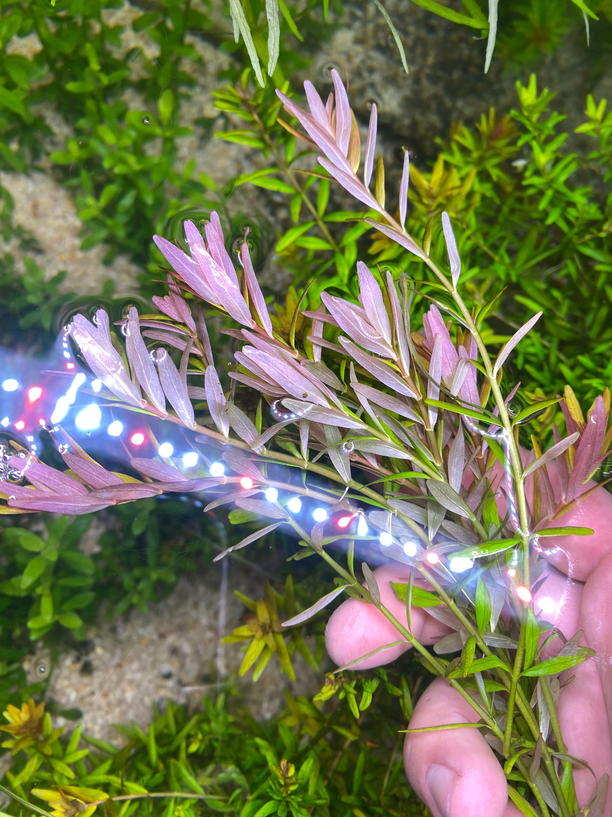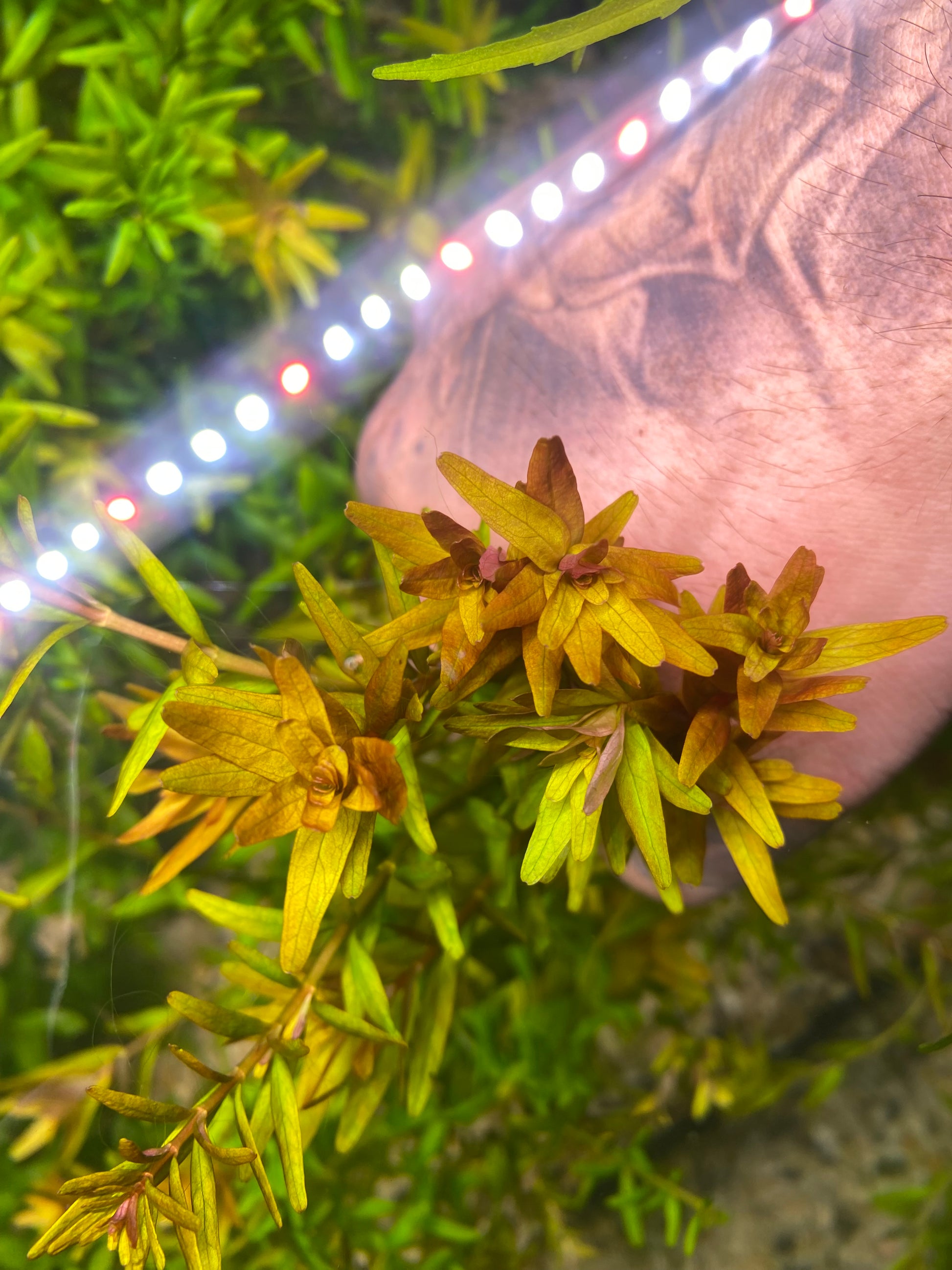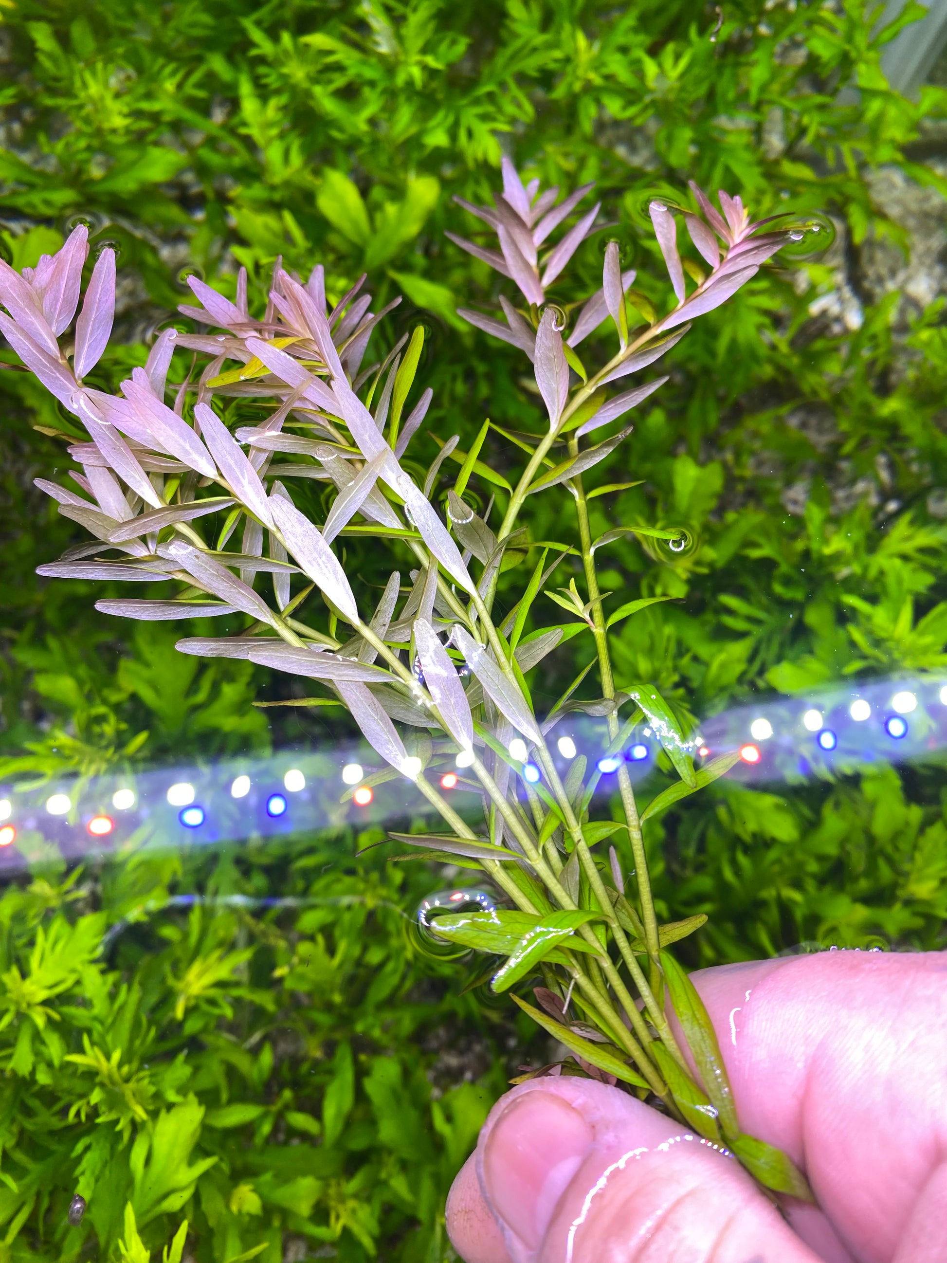 Rotala Rotundifolia is one of the easiest stem plants to care for. It can be in a variety of water parameters and doesn't need fancy lighting. Under low to medium light it yields a more yellow-green color, and high lighting yields a pink color and pink undertones on the leaves. It can be easily propagated by snipping the top and replanting. A great addition to a midground or background.